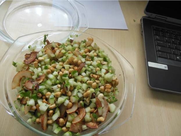 Preparation: You can prepare all the components ahead of time, but don’t toss the salad until just before serving. If you do the peanuts will lose their crunch because the cucumbers give off a good amount of water. Halve the cucumbers lengthwise, scrape out the seeds and chop into small pieces (diced). When Sunflower oil is hot, stir in the mustard seeds. They are going to sputter and spit a bit, and when this starts to happen, add the cumin for 15-30 seconds, (else it will get burnt!). Cover with a lid if needed. Remove from heat, stir in the salt, and immediately stir this into the salad.